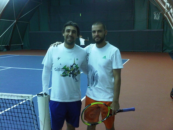 Marcos and Mikhail Youzhny warming up.